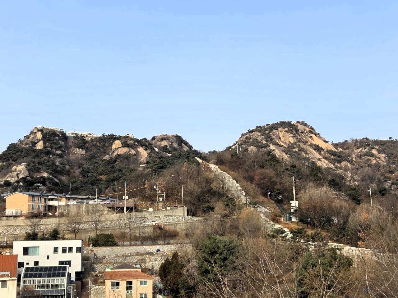 북악산 능선이 부드럽게 이어지고, 멀리 남산타워가 도심 위로 고개를 내민다.